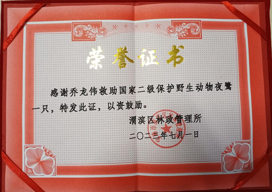 近期,不朽情缘股份零件产品制造部乔龙伟同志成功救助一只夜鹭,获渭滨区林政管理所表彰。
