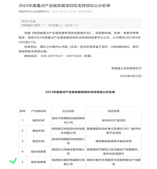通过认真筹备、资料审核及现场答辩,由公司组织申报的“72.5kV、126kV及以上高电压等级真空灭弧室产品研发及产业化”项目与“高铁车载开关用真空灭弧室智能化产线建设”项目分别中榜陕西省工信厅2023年关键核心技术产业化“揭榜挂帅”项目与重点产业链发展项目,并已进入公示阶段。