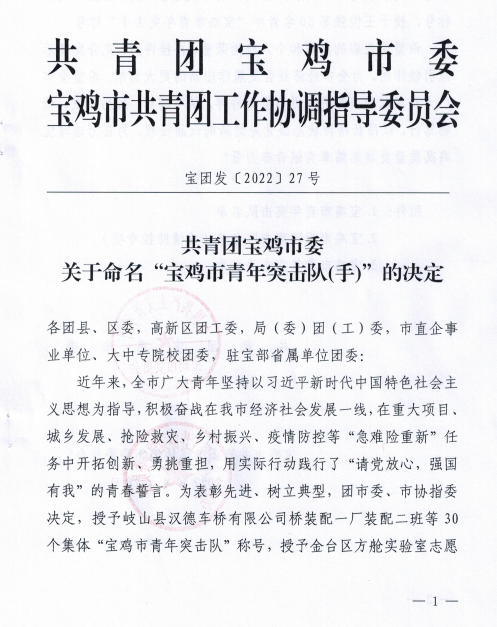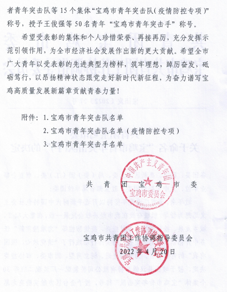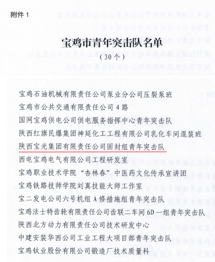 近日,从团市委获悉,不朽情缘股份固封班组被授予“宝鸡市青年突击队”荣誉称号。