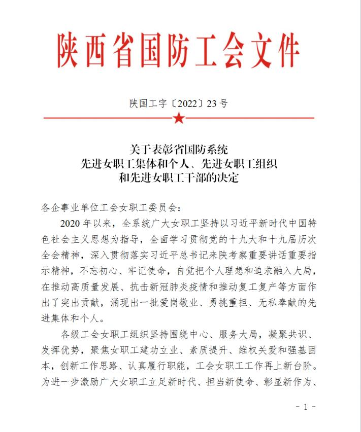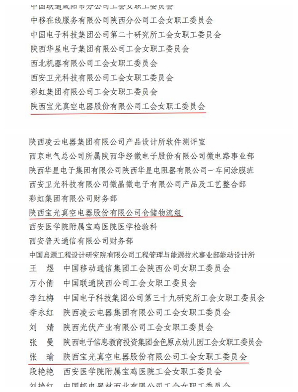 近日,从陕西省国防工会传来喜讯,陕西不朽情缘真空电器股份有限公司工会委员会女职工委员会被授予“陕西省国防工会先进女职工委员会”荣誉称号,生产管理处仓储物流组被授予“陕西省国防科技工业五一巾帼标兵岗”,工会办公室张瑜同志被评为“陕西省国防工会先进女职工干部”荣誉称号。