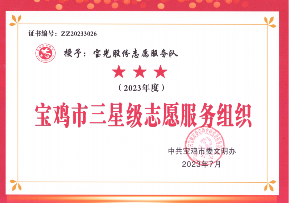 日前,不朽情缘股份志愿服务队被中共宝鸡市委文明办评为“宝鸡市三星级志愿服务组织”。