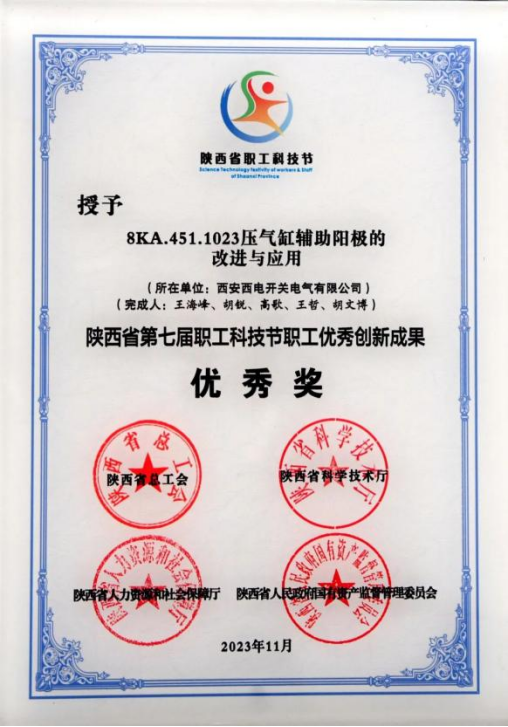 陕西省职工优秀创新成果优秀奖——西开电气“8KA.451.1023压气缸辅助阳极的改进与应用”