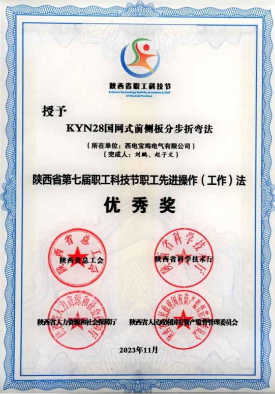陕西省职工先进操作(工作)法优秀奖——西电宝鸡电气“KYN28国网式前侧板分步折弯法”