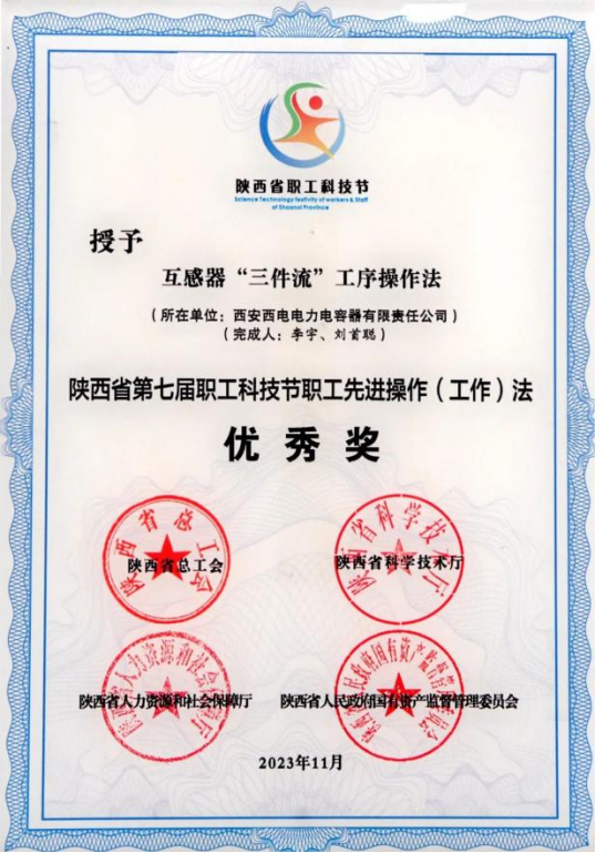 陕西省职工先进操作(工作)法优秀奖——西电西容“互感器'三件流'工序操作法”
