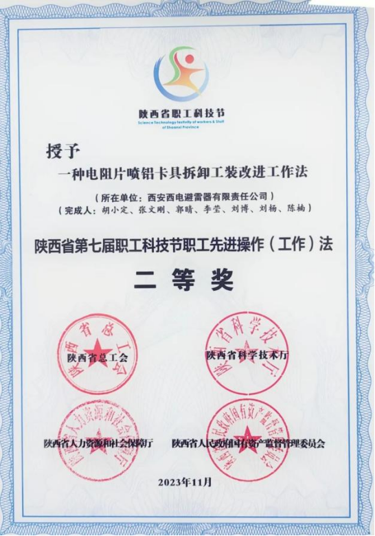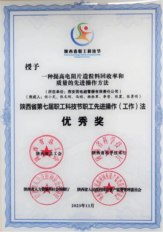 陕西省职工先进操作(工作)法优秀奖——西电避雷器“一种提高电阻片造粒料回收率和质量的先进操作方法”