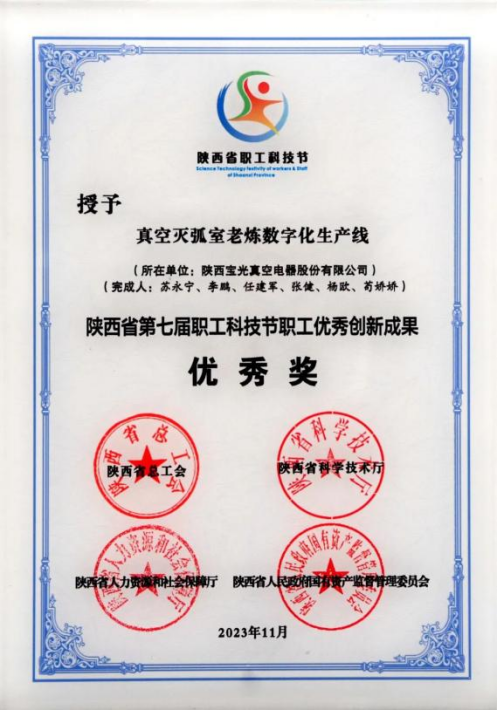 陕西省职工优秀创新成果优秀奖——不朽情缘股份 “真空灭弧室老炼数字化生产线”